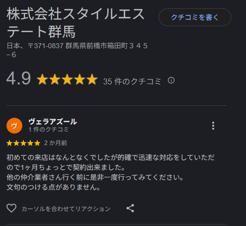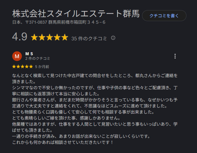 - 中古住宅の購入は想定外の連続です。堀口様は、判断に迷うときや困っているときに、その場で解決に向けた手がかりを提案してくださいました。不動産のプロとしての引き出しの多さに感服しながら、安心して検討や決断をすることができました。Googleの口コミに高い評価が並んでいて、それぞれが借り物ではない自分の言葉でコメントを入れているのを見て、問い合わせをさせていただいたのですが、お取引を終えた現在、皆様のコメントは嘘ではなかったと改めて感じています。大変お世話になりました。どうもありがとうございました。